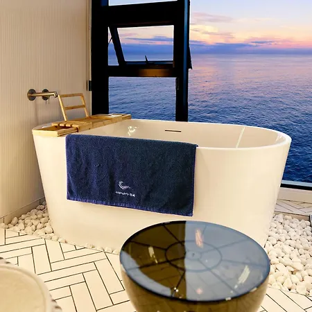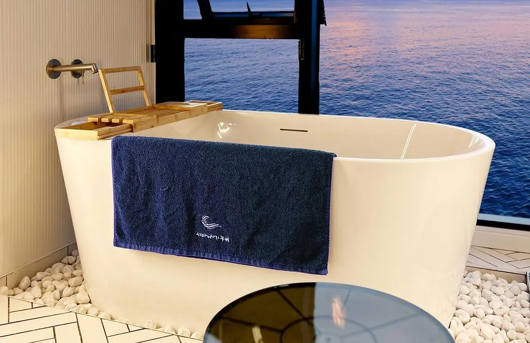 제주 저바다에누워 오션뷰 펜션 faces the sea. This property includes a bathroom with a separate toilet and a shower. A hair dryer, bath sheets, and bathrobes are included for added comfort.